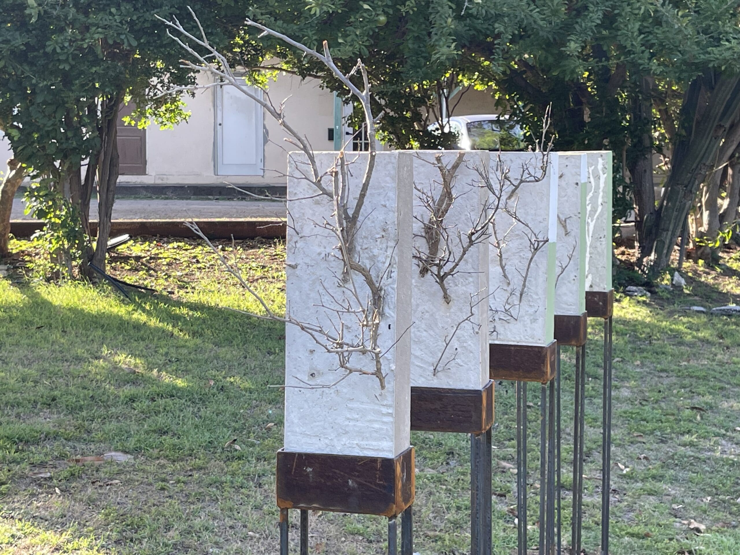 Ailsa Anastatia (1978) was born in Curaçao. From 1997 to 2001 she attended the Academy of Visual Arts in Tilburg, the Netherlands. After receiving her first teacher’s degree she subscribed at the Art Academy Amsterdam in 2001. Three years later she received her degree first grade teacher for Visual arts and Design (2004). Ailsa Anastasia teaches at Kolegio A. de Paula (KAP) since 2007. Ailsa is known for her installations, drawings and paintings inspired by the theme space. Physical space, space between people, inner space, open or closed spaces, but also social/ cultural/ spiritual “spaces”. The way in which we interact with our surrounding space and how we move within the space. The variety of materials and techniques used in her work depends on the story she wishes to convey. About ‘I own this piece of land’ the artist says: “This piece is about local ‘deforestation’. In the process of ‘making the space our own’ we sometimes forget that we are causing serious damage to our ecosystem. The solid concrete blocks are a symbol for human invasion and imbalance against nature. The branches used in this installation were picked at a new construction site that has been stripped. This is a phenomenon that happens in the Caribbean too, maybe on a smaller scale but it happens too often.