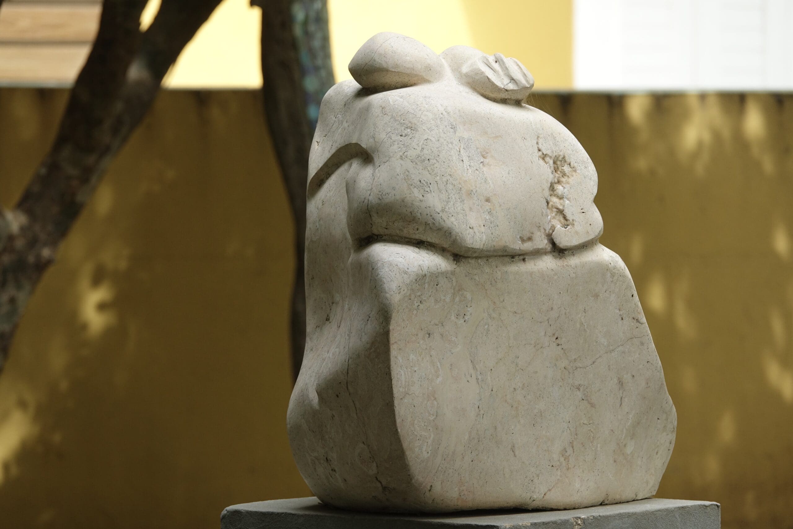 Closer to the entrance to the plantation house stands a cream-colored sculpture by Hortence Brouwn (1938), called ‘Sweet Protection’. A well-chosen title that has endowed the massive, (but, due to its flowing lines, not rigid) statue, with a sweet character. Menno and Christina Vermeulen-Meiners, and also a little, as a result of their mutual agreement with Hortence Brouwn, have all donated this statue made of Tafelberg stone to the Sculpture Garden Foundation.