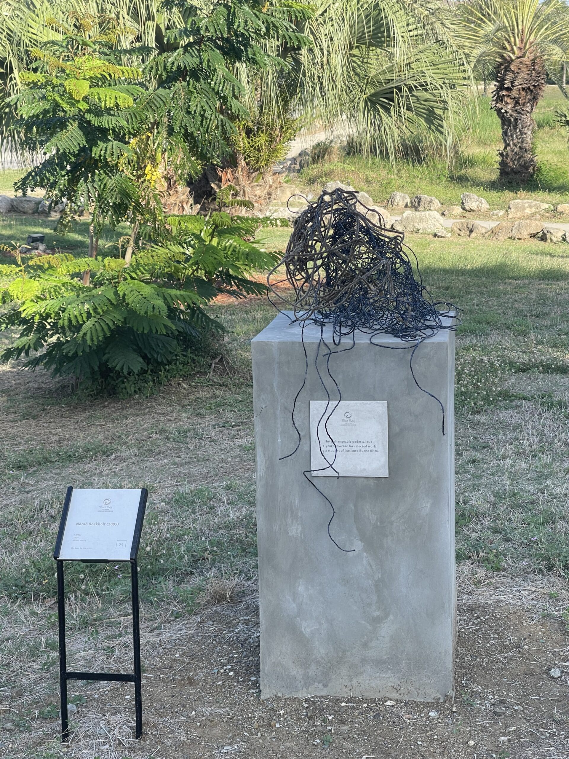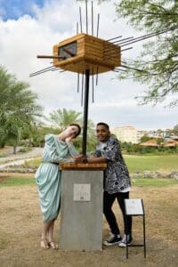 Leonie Lewin (20) and Sean G. Capella (19), students at Instituto Buena Bista, created the sculpture Hiding in Plain Spikes, which has been selected for the collection of the Blue Bay Sculpture Garden Foundation. Their work is inspired by the symbiotic relationship between a hermit crab and a sea urchin. Using wood and metal, they depict how vulnerability and protection can strengthen one another. The geometric spikes refer to the sun, while the hermit crab curiously gazes out into the world. The work is not only a visual narrative but also an ode to collaboration and personal growth.