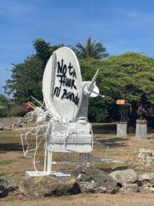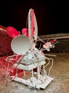 As in much of his work, Martha here uses everyday materials from construction sites or the street, which acquire a new meaning in a different context. The sculpture thus carries a social weight and responsibility. A striking detail is the graffiti on the middle plate: “No ta Huur ni Bende!” (Not for Rent nor for Sale) – a powerful statement that invites reflection.