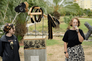 Madou Lammers and Stephanie de Araujo, students at Instituto Buena Bista, created the sculpture Fish. In their work, the underwater world comes to life. Inspired by skeletons in museums and constructed from wood and metal, they designed an abstract skeleton of an orca. The pedestal, painted by Stephanie, depicts a dreamy, painted habitat of the animal. The work, which sometimes sways gently in the wind, seems to long for the distant sea — a subtle, poetic reference to life, transience, and movement.