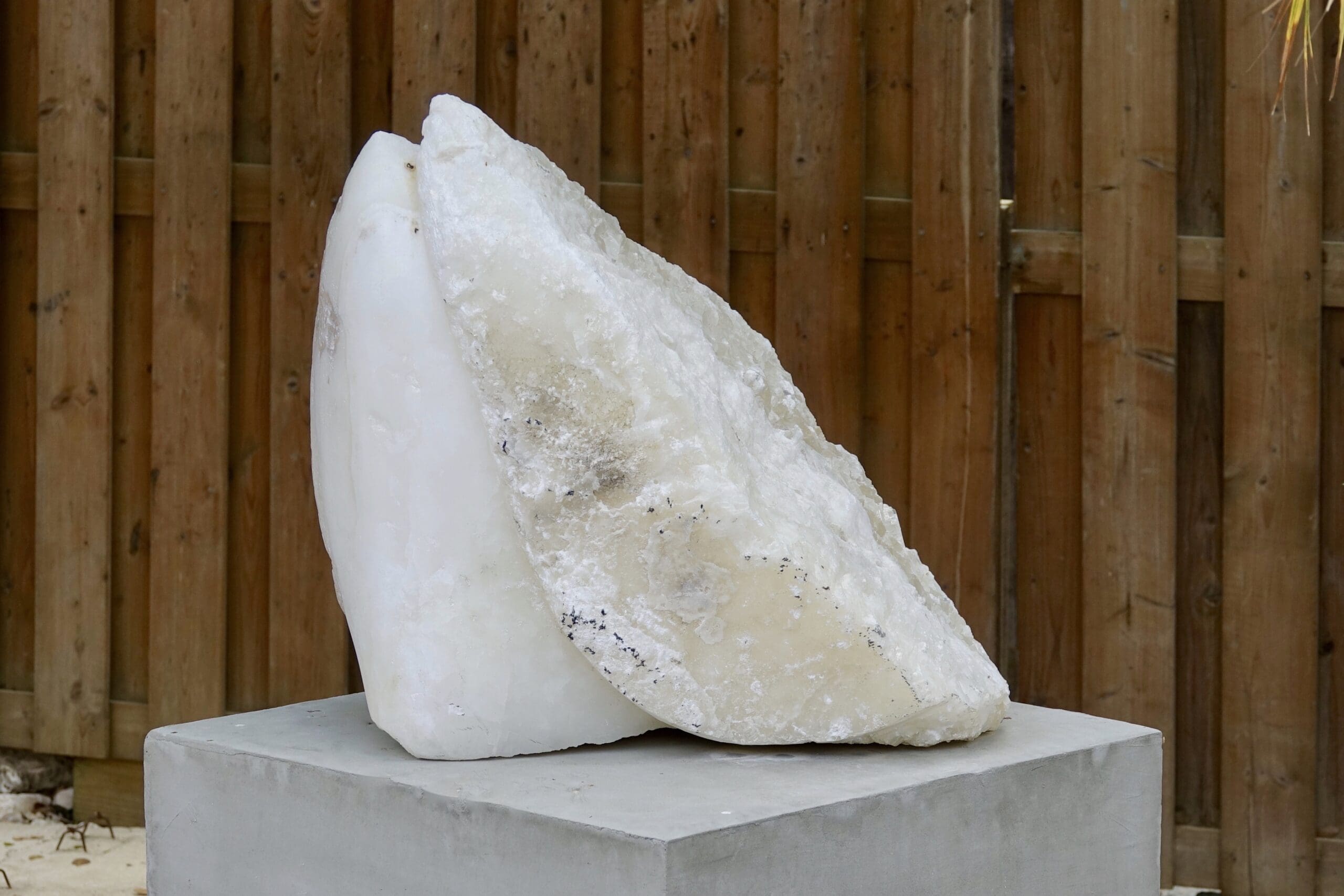Twee-eenheid, de witte steen is een calciet-kristal uit de Tafelberg, in twee delen gekliefd. De beeldtaal van ruw en glad, lijn en vlakte, bol en hol moet deze bijzondere vorm versterken. Dit beeld van Wawoe (1939-2025) is een symbool van de verdeeldheid die tot eenheid wordt.
